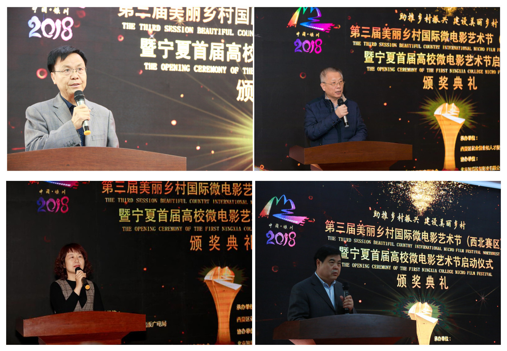 北方民族大學(xué)創(chuàng)新創(chuàng)業(yè)學(xué)院院長(zhǎng)王福平首先致歡迎辭歡迎各界人士的到來(lái);隨后,中國(guó)農(nóng)業(yè)電影電視協(xié)會(huì)副理事長(zhǎng)兼秘書(shū)長(zhǎng)張杰、銀川市西夏區(qū)委政法委副書(shū)記/西夏區(qū)就業(yè)創(chuàng)業(yè)和人才服務(wù)局局長(zhǎng)李曉穎、寧夏回族自治區(qū)新聞出版廣電局傳媒機(jī)構(gòu)管理與宣傳處處長(zhǎng)/網(wǎng)絡(luò)視聽(tīng)節(jié)目管理處處長(zhǎng)黨建業(yè)分別在本次微電影藝術(shù)節(jié)上進(jìn)行了致辭,各位領(lǐng)導(dǎo)對(duì)2018美麗鄉(xiāng)村國(guó)際微電影藝術(shù)節(jié)西北賽區(qū)的隆重舉行表示熱烈祝賀與祝福。