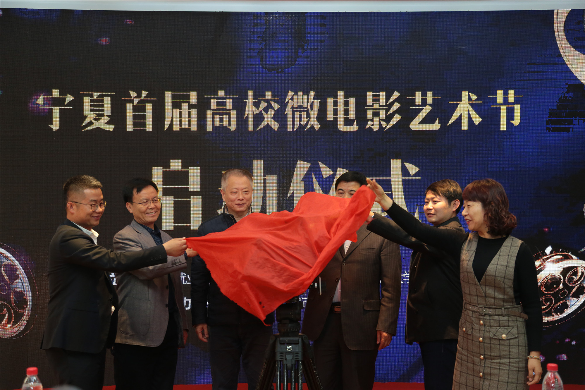 活動(dòng)最后寧夏回族自治區(qū)新聞出版廣電局傳媒機(jī)構(gòu)管理與宣傳處處長(zhǎng)、網(wǎng)絡(luò)視聽(tīng)節(jié)目管理處處長(zhǎng)黨建業(yè),中國(guó)農(nóng)業(yè)電影電視協(xié)會(huì)副理事長(zhǎng)兼秘書(shū)長(zhǎng)張杰,寧夏回族自治區(qū)新聞出版廣電局電影處吳鵬,銀川市西夏區(qū)委政法委副書(shū)記、西夏區(qū)就業(yè)創(chuàng)業(yè)和人才服務(wù)局局長(zhǎng)李曉穎,北方民族大學(xué)創(chuàng)新創(chuàng)業(yè)學(xué)院院長(zhǎng)王福平,寧夏回族自治區(qū)微電影協(xié)會(huì)會(huì)長(zhǎng)魏軍共同為寧夏首屆高校微電影藝術(shù)節(jié)進(jìn)行了啟動(dòng)揭幕。