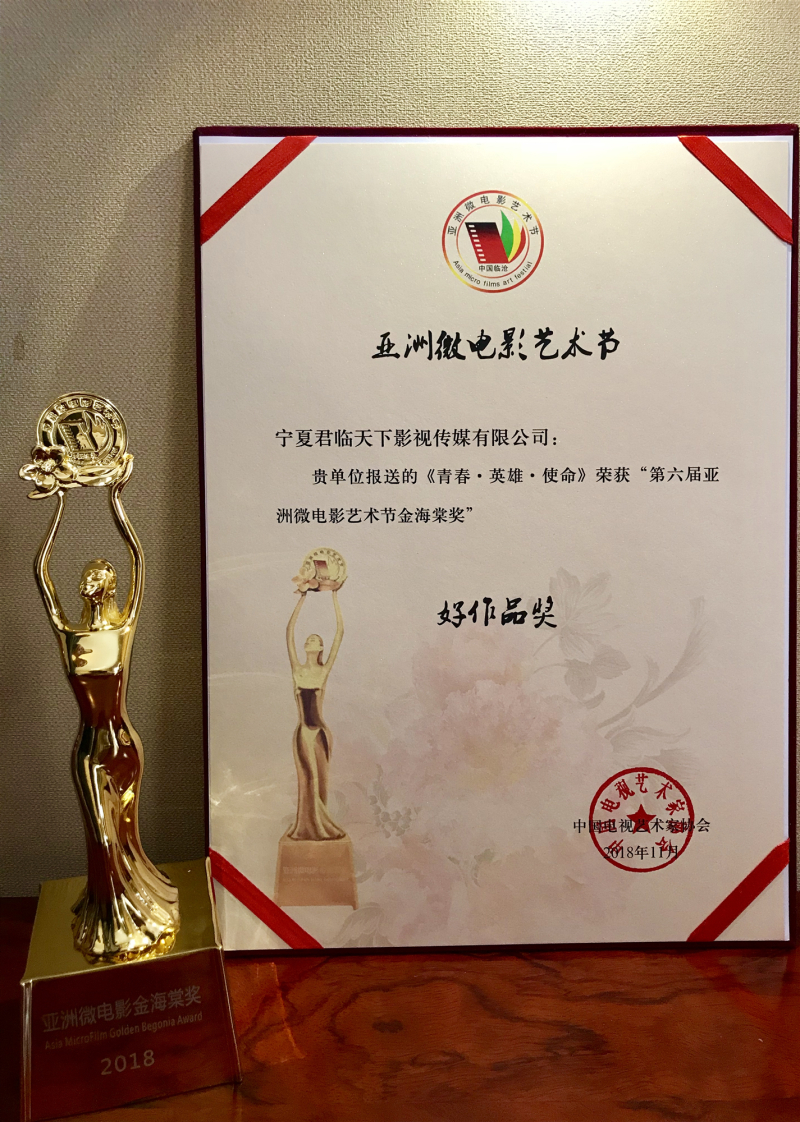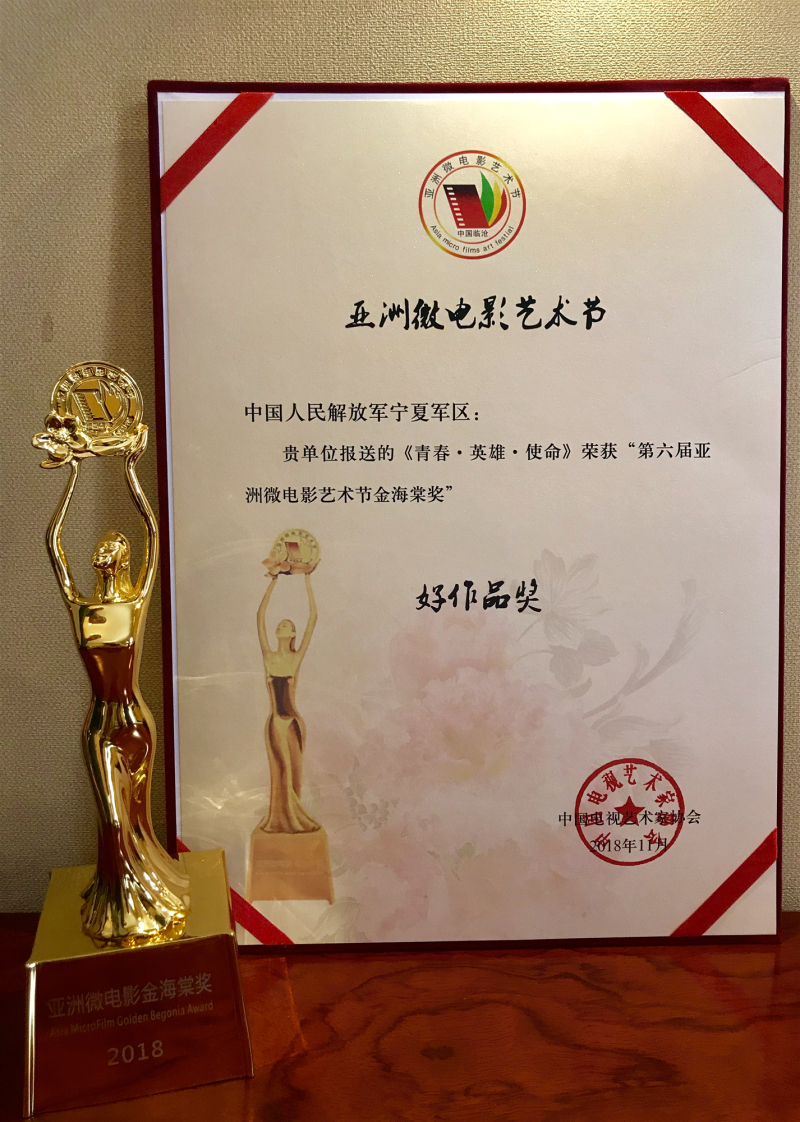 11月7日,第六屆亞洲微電影藝術節(jié)頒獎典禮在云南臨滄舉行,由中國人民解放軍寧夏軍區(qū)出品,寧夏回族自治區(qū)微電影協(xié)會、寧夏君臨天下影視傳媒有限公司、北京獨瑪拉初影業(yè)有限公司拍攝的公益征兵影片《青春·英雄·使命》榮獲第六屆亞洲微電影藝術節(jié)“金海棠”大獎。